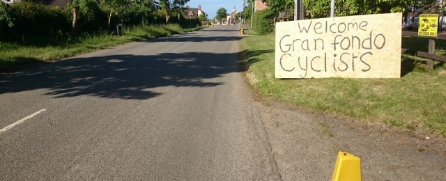 The first cycling Tour Of Cambridgeshire took place in June 2015 The route on public roads that were closed specifically for the race to happen. Around 5000 cyclists were reported to have signed up to take part. So on a stunningly glorious day we watched and waited to see what 5000 cyclists looked like speeding through the village. What a spectacle apart from the heads down first few hundred who were on a mission to win the great mass of riders responded in kind to the roadside cheering and reserved clapping that Brits do so well. It was a grand spectacle and is to be repeated in 2016 on the same route. A Gran Fondo is a cycling event on closed roads for mass participation.
