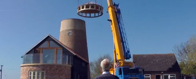 On 21st April as work progresses on the transformation of the mill in Great Gidding, the village turned out to see the final ‘topping-out’ of the project. On a bright and sunny morning a crane arrived to lift the new roof into place onto of the mill tower.