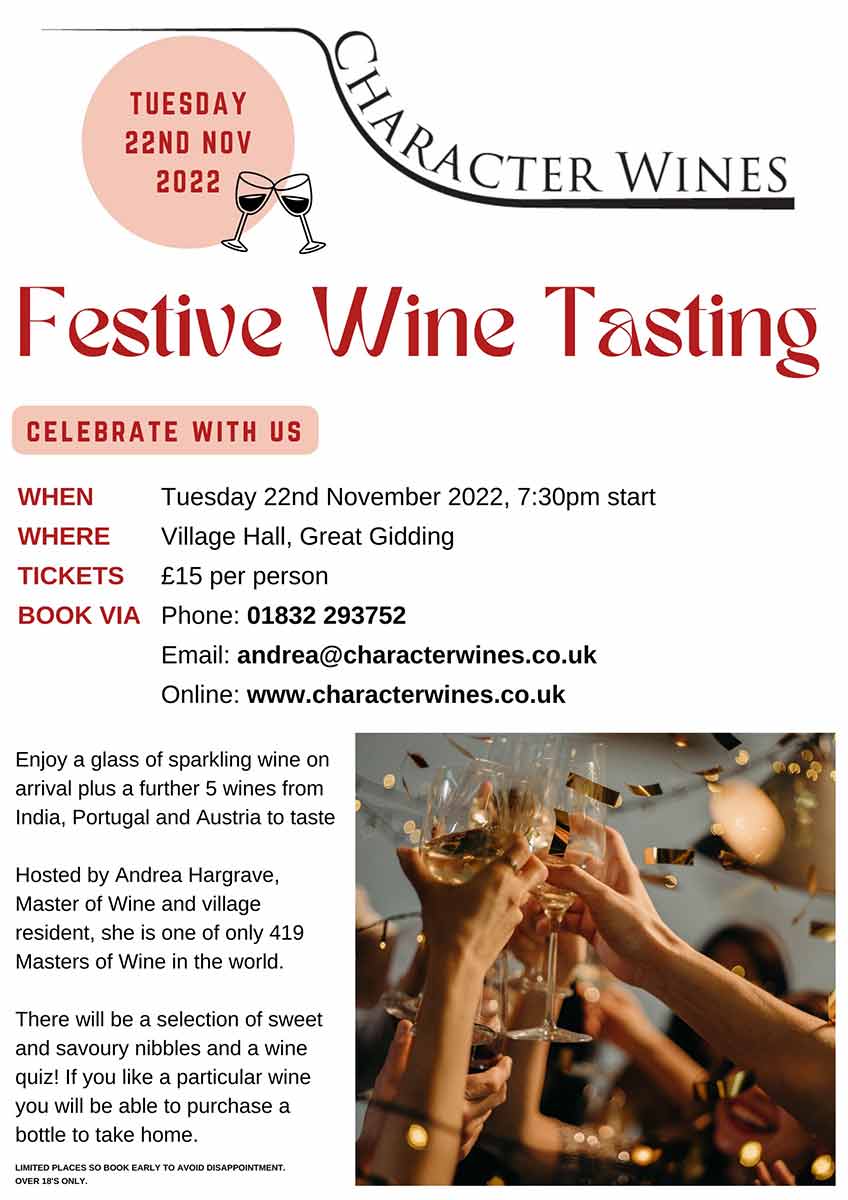 Sample some amazing wines with Andrea Hargrave – Great Gidding’s very own Master of Wine! Andrea has over 25 years of experience and is one of only 419 Masters of Wine scattered over 30 countries and 6 continents.