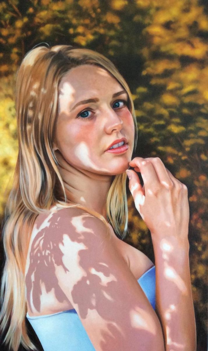 I asked Ashlea if she would be willing to pose for a series of paintings called ‘Autumn Light’. She agreed and I took a range of reference photos in the Jubilee Wood and later in the field by the side of Alconbury brook This portrait is the first in the series.”