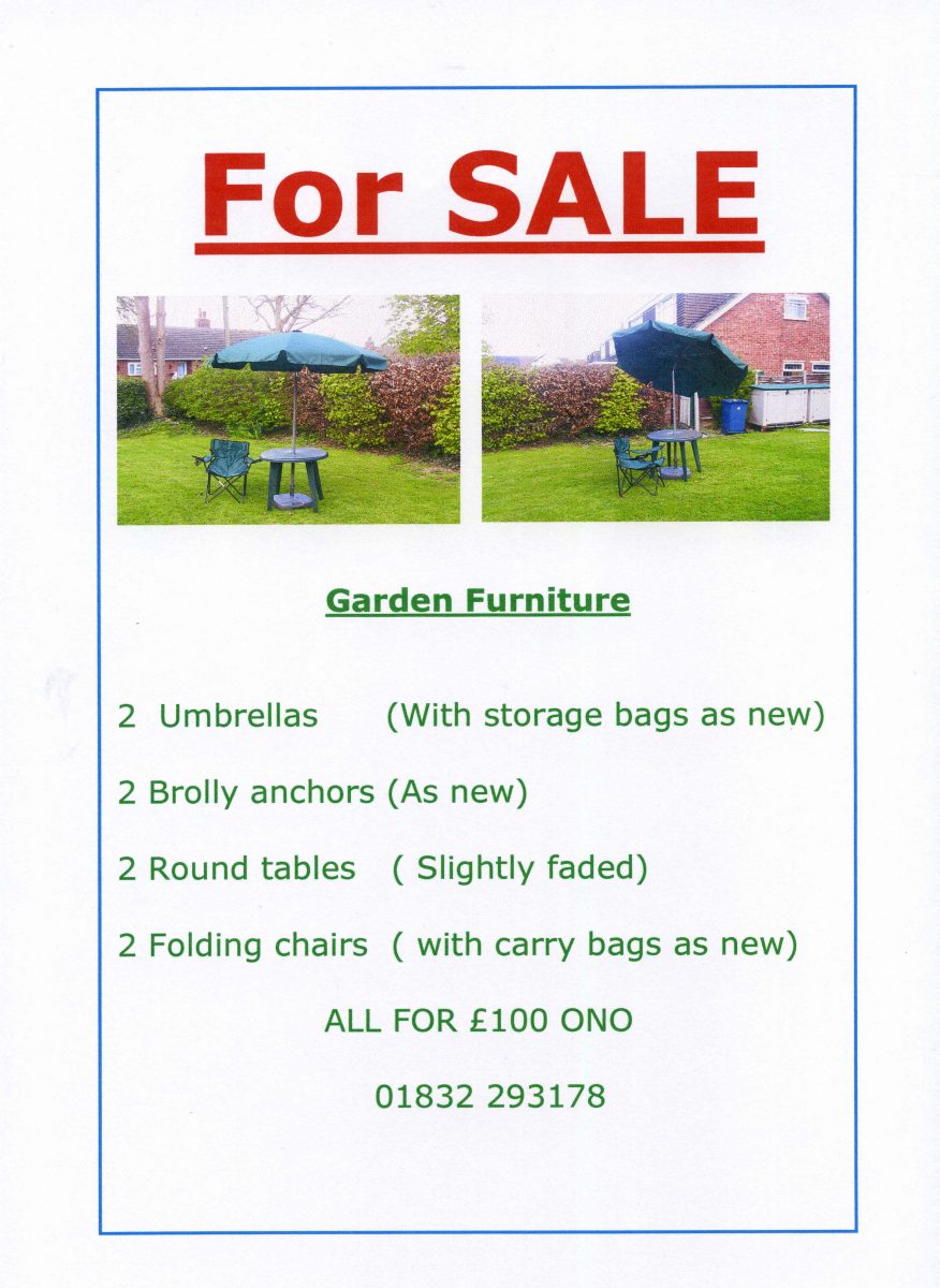 A Giddings resident has some garden furniture for sale in time for summer. The contact telephone number is 01832 293178.