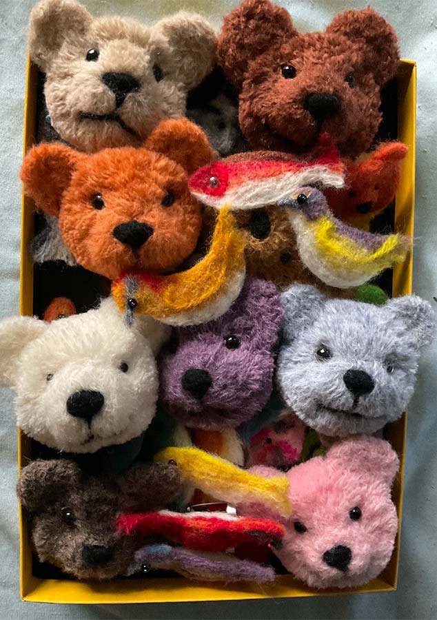 Sue’s from dark and dull ‘up North’, but her felt brooches feature colourful woodland characters and playful teddy bears who are completely at home in the Giddings countryside.