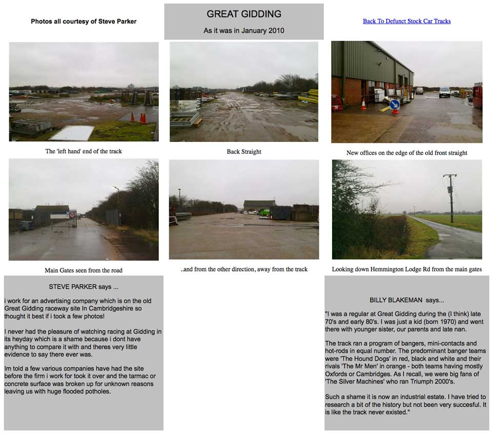 Great Gidding in Cambridgeshire where Northampton’s John Clark promoted GP Midgets. Now an industrial estate off Hemmington Lodge Lane. Steven Parker, who works at the site today says “there’s very little evidence …the tarmac or concrete surface was broken up for unknown reasons leaving us with huge flooded potholes. …you can still see where the carpark would have been near the entrance for spectators & racers although its like a jungle now!.” More of Steve’s photos can be seen on the Gt Gidding page – www.simonlewis.com/gidding.html.