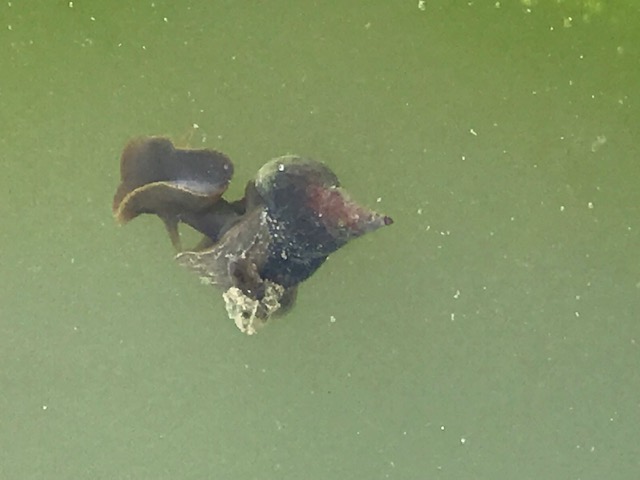 The Great Pond Snails Lymnaea stagnalis, are putting on a wonderful display (for a snail) of acrobatics at the moment. It might not seem very likely, but if you have the time to stand or (very carefully) crouch by the side of the pond and watch them they show a remarkable ability to move around and almost dance in the water. There are about 40 different kinds of water snails in Britain and the Great Pond Snail is the biggest growing up to 4cm. Surprisingly perhaps, they breathe with lungs and have a respiratory tube which serves as a snorkel to get fresh air without the need to surface. Watch them for long enough and you’ll see it!