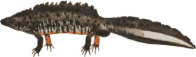 The Great Crested newt, growing to about 16 centimetres long, is the largest of Britain’s three native newts. Dark in colour, often black, and patterned with small white spots they have orange or yellow bellies with black blotches – a warning to would-be predators that they are poisonous to eat! These underside markings are unique to each newt which makes tracking individuals a little easier.